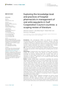 Abstract Introduction: Oral anticoagulants (OACs) are essential for managing thromboembolic events and cardiovascular conditions. However, they carry a significant bleeding risk. Pharmacists play a critical role in ensuring the safe and effective use of these medications. Within Gulf Cooperation Council (GCC) countries, hospital pharmacists are involved in managing OACs. However, region specific data on their knowledge and practices remain limited. Aim: This review analysed existing literature regarding hospital pharmacists' knowledge and practices in OACs dispensing and counselling within the GCC countries. Methodology: A literature search was conducted in Scopus, Web of Science, PubMed and PsycINFO. Articles that explored the hospital pharmacist's knowledge and practices regarding OACs were included. There were no restrictions on study design, publication date, or language. Searches were undertaken on February 1, 2025 then re-run on October 28, 2025, following PRISMA-ScR and JBI guidelines. Results: Findings revealed gaps in pharmacists' knowledge and practices regarding OACs management. Out of 75 articles identified, seven met inclusion criteria, representing studies from Bahrain, Kuwait, Oman, Qatar, Saudi Arabia, and the United Arab Emirates (UAE). All were cross-sectional and utilized validated questionnaires. A study from Saudi Arabia and another from the UAE reported gaps in warfarin knowledge. Counselling practices were suboptimal in both studies. The study by Al-Arifi et al., further identified insufficient knowledge of warfarin interactions. Beyond warfarin, one study reported deficiencies in rivaroxaban knowledge and counselling, while another found moderate awareness of direct oral anticoagulants (DOACs) (mean score 41.6% ± 26%). Al-jedai et al., reported inadequate practice in OACs dispensing and monitoring, and another study found greater pharmacists' confidence in counselling on vitamin K antagonists (VKAs) (67%) than on DOACs (49%). Discussion: Findings highlight inadequate knowledge and practice among pharmacists regarding OACs. Although all studies included community pharmacists and other healthcare providers, none focused exclusively on hospital pharmacists, who are more directly involved in OAC management in the GCC. All studies relied solely on self-reported data, increasing bias. Most studies originated from Qatar, Saudi Arabia, and the UAE, reducing generalizability. Nevertheless, addressing knowledge gaps could improve hospital pharmacists' practice on OACs management, improving patient safety, and optimising therapeutic outcomes.
