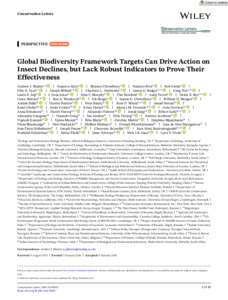 Bladon, A. J. ORCID: https://orcid.org/0000-0002-2677-1247, Akite, P., Chowdhury, S., Riva, F., Cooke, R., Dyer, E. E., Millard, J., Outhwaite, C. L., Rodger, J. G., Hui, C., Isip, J. E., Jones, J. I., Murphy, J. F., Newbold, T., Purvis, A., Roy, H. E., Skinner, G., Woodcock, B. A., Berger, I., Choudhury, S. U., Morgan, W. H., Báldi, A., Bartlett, H., Batáry, P., Bihaly, Á. D., Borzée, A., Chobot, K., Crosier, J., Deiner, K., Devenish, A. J. M., Devriese, A., Ermakova, A., Farooq, H., Fedotov, A., Gaigr, J., Gallé, R., Gategeko, A., Gong, H., Gordon, I., Herzog, F., Jacobson, A., Kamath, V., Manral, U., Marja, R., Martin, C., Mpayimana, D., Mutekanga, F., Naskrecki, P., Ndahayo, P., Nkurikiyimana, D., de Dieu Nsenganeza, J., Ntibabarira, J. P., Poston, J., Reynolds, C., Ruticumugambi, J. A., Srikanthan, P., Török, E., Yekwayo, I., Isaac, N. J. B. and Dicks, L. V. (2026) Global Biodiversity Framework targets can drive action on insect declines, but lack robust indicators to prove their effectiveness. Conservation Letters, 19 (2). e70025. ISSN 1755-263X doi: 10.1111/con4.70025