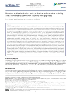 D-amino acid substitution and cyclization enhance the stability and antimicrobial activity of arginine-rich peptides.