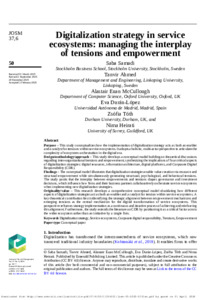 Samadilashkariani, S., Ahmed, T., McCullough, A., Durán López, E., Tóth, Z. and Heirati, N. ORCID: https://orcid.org/0000-0001-7892-7082 (2026) Digitalization strategy in service ecosystems: managing the interplay of tensions and empowerment. Journal of Service Management, 37 (6). pp. 50-77. ISSN 1757-5826 doi: 10.1108/JOSM-03-2025-0151