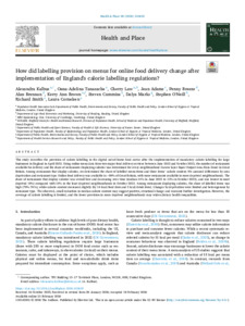 Kalbus, A., Tanasache, O.-A., Law, C. ORCID: https://orcid.org/0000-0003-0686-1998, Adams, J., Breeze, P., Brennan, A., Brown, K. A., Cummins, S., Marks, D., O'Neil, S., Smith, R. and Cornelsen, L. (2026) How did labelling provision on menus for online food delivery change after implementation of England's calorie labelling regulations? Health & Place, 98. 103635. ISSN 1353-8292 doi: 10.1016/j.healthplace.2026.103635