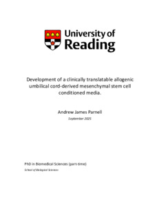 Parnell, A. J. (2026) Development of a clinically translatable allogenic umbilical cord-derived mesenchymal stem cell conditioned media. PhD thesis, University of Reading. doi: 10.48683/1926.00129233