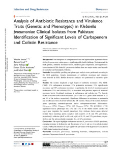 Analysis of antibiotic resistance and virulence traits (genetic and phenotypic) in Klebsiella pneumoniae clinical isolates from Pakistan; identification of significant levels of carbapenem and colistin resistance.