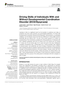 Gentle, J., Brady, D., Woodger, N., Croston, S. and Leonard, H. C. (2021) Driving skills of individuals with and without Developmental Coordination Disorder (DCD/Dyspraxia). Frontiers in Human Neuroscience, 15. 635649. ISSN 1662-5161 doi: 10.3389/fnhum.2021.635649